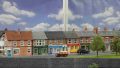 向こう側の国鉄ヤードとの境はコンクリート塀(RATIO製)で仕切るが半分見える高さで、丁度プルマンカーの窓/テーブルランプが見える。駅前ではイギリス特有の電話BOX、ポスト、サンドイッチショップ、手前側の2種のゴミ箱、そしてフィギュアなどはHORNBY製で、このような小物に至るまで、イギリス型はストラクチャーが多く(廉価に)揃うので有難い。