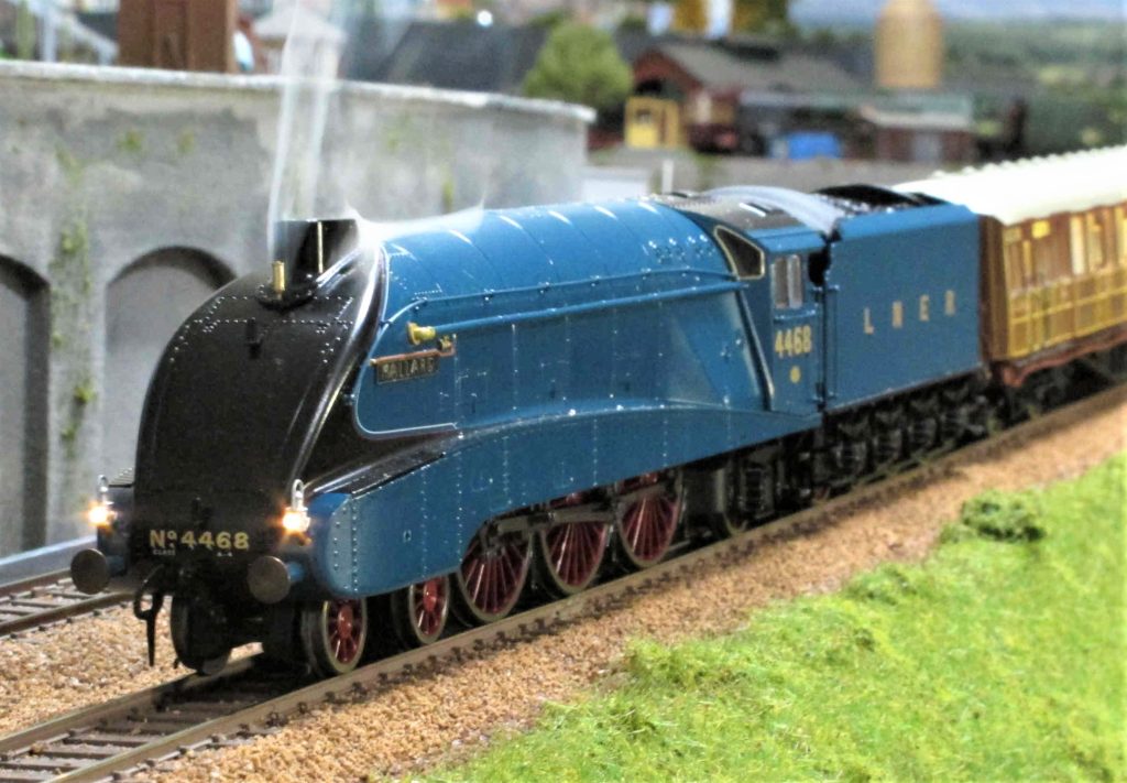 写真は有名な世界最高速度記録を持つLNER A4型 マラードが”フライングスコッツマン号”を牽く。英Dapol社製で、この製品は素晴らしく、発煙装置で煙を出し、警笛ではホイッスルから蒸気(煙)を噴き上げ、ライト(ヘッドランプ)の点灯、そして運転席の火口ではシャベル音と共に火口で赤い光がチラつく。