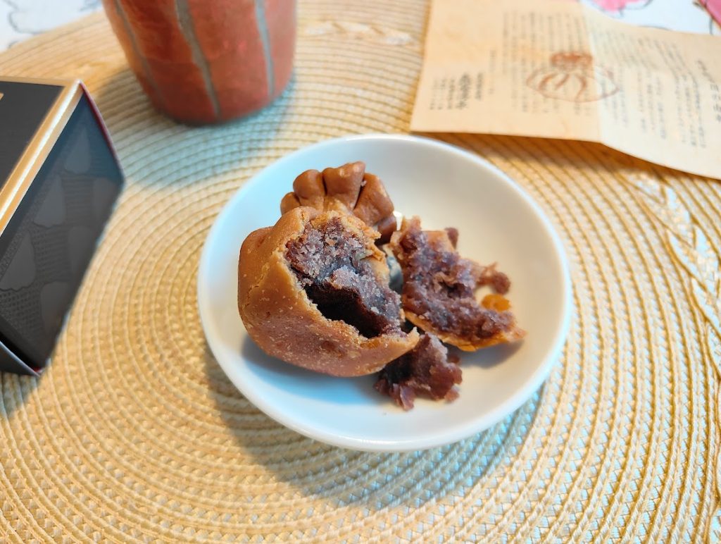 肝心の味は、というと、まず皮が硬いので底の部分から割って食べるのだが、皮は流石に脂っ濃く、また妙な味がする、中の餡子はパサついているが普通に美味しい・・かな。
