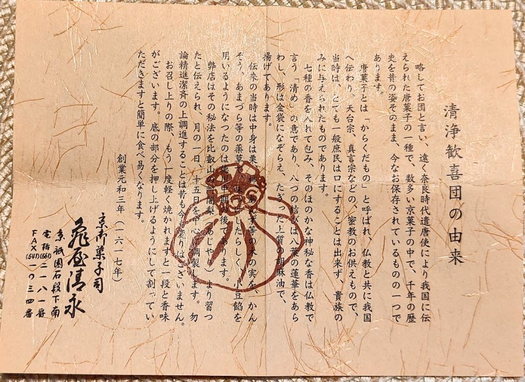巾着状の袋は胡麻油で揚げて有り、中は餡子になっているが、当初は・栗・柿・あんず・薬草など7種の香だった旨だが、徳川中期に小豆餡になったとのこと。