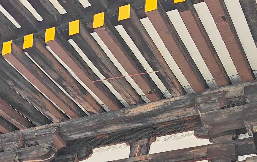 よって、軒に当たらないよう矢を射るそうだが、これまでに軒先に打ち込んでしまった矢が残っているとのこと。