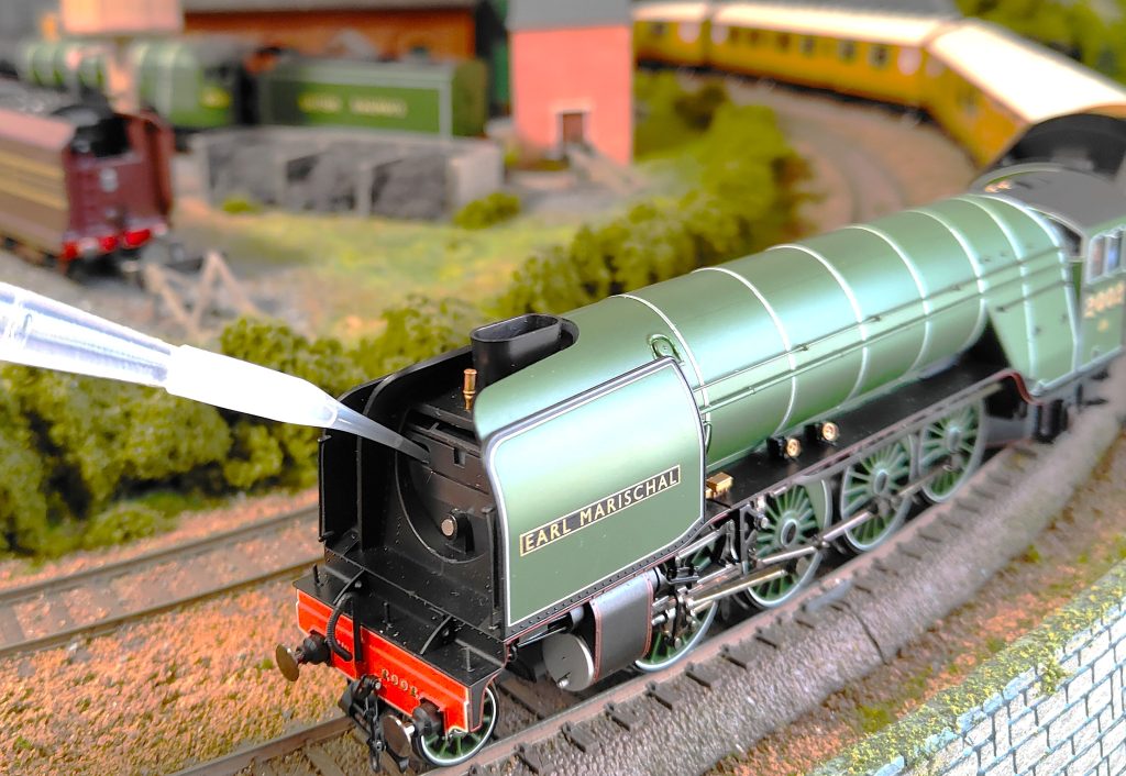 ボイラー前面にある煙室扉部分は磁石で吸着する構造になっており、簡単に引いて外すことが出来る。すると給水用の注入口があり、模型の付属パーツとして入っていたスポイトで写真のように水を注入する。