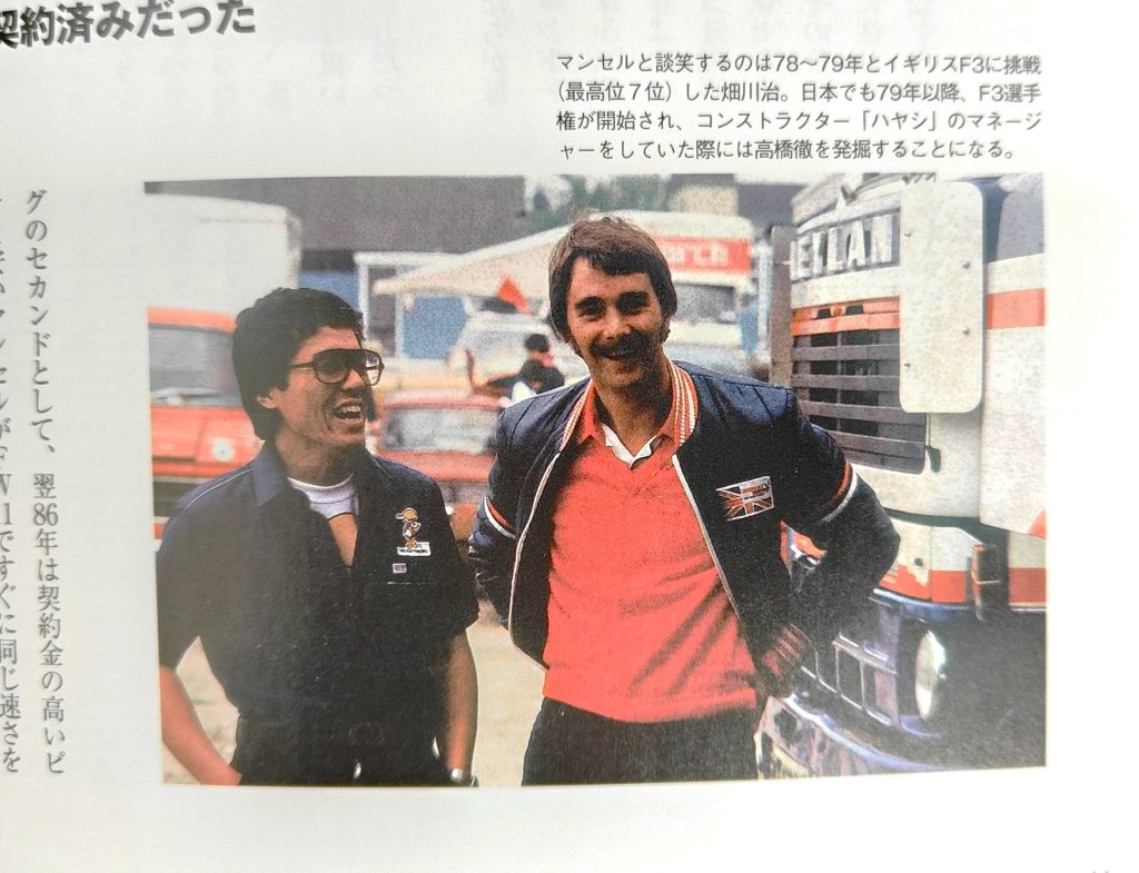 私が1979年にイギリスのF3レースに参戦していた時のもので、彼も同じレースを走っており、たまたま私のレースのマネージメントをして頂いた方がマンセルとの知り合いで、こうしてパドックで写して頂いた写真だ。因みに談笑するほど私は英語を喋れなかったが。